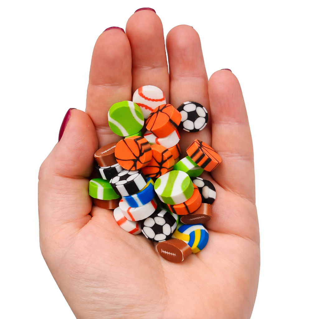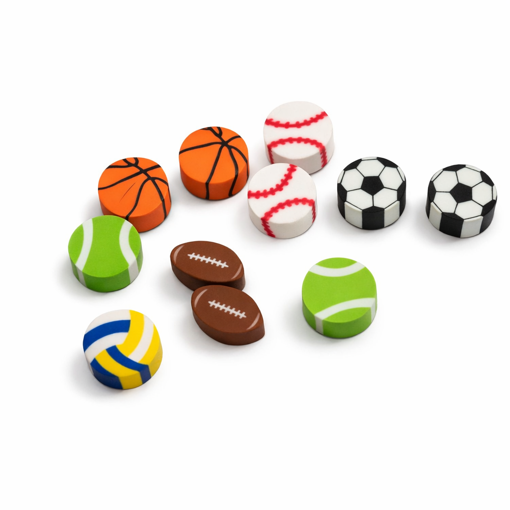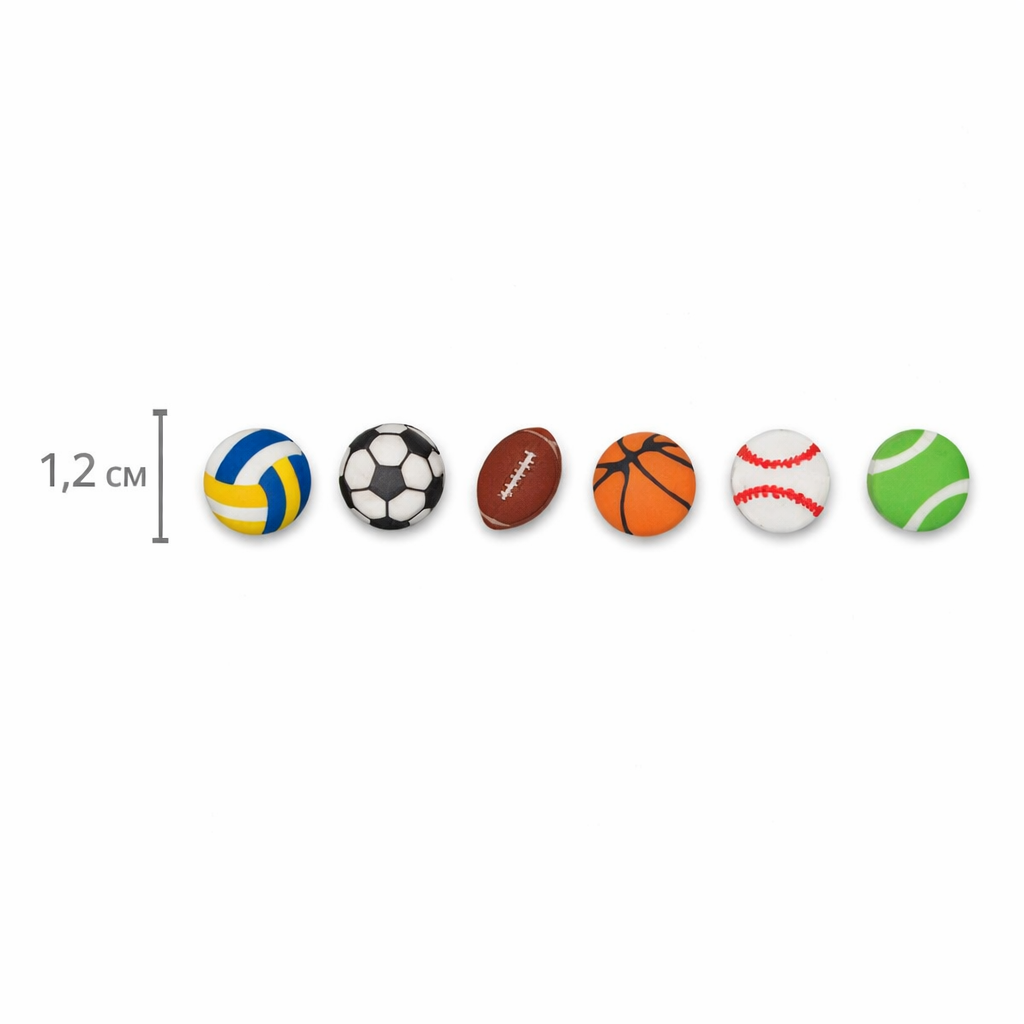 Набор ярких ластиков в виде популярных спортивных мячей.