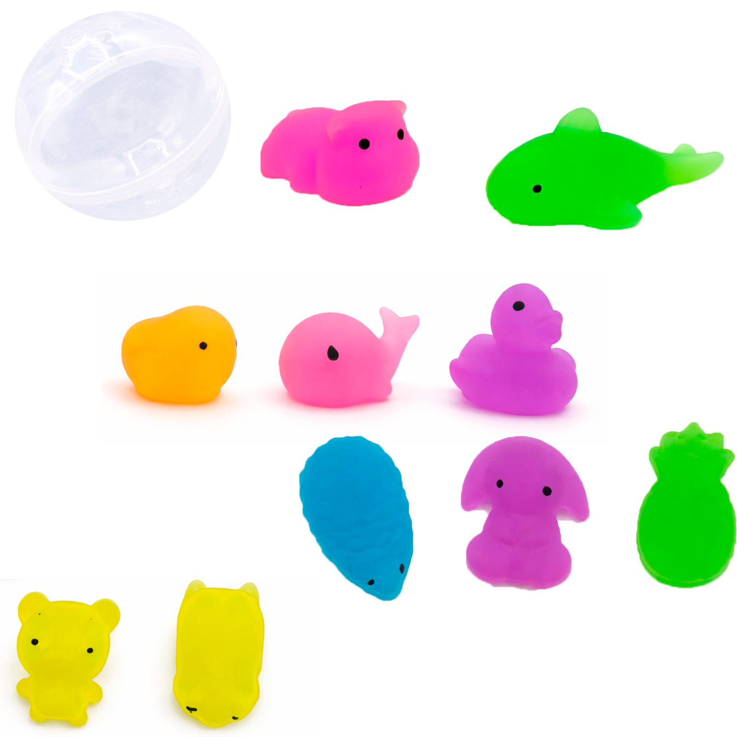 В составе наших миксов - наимилейшие маленькие игрушки-мялки в виде различных животных. Они очень мягкие на ощупь и чудесно снимают стресс, развивают моторику рук и расслабляют. К тому же, сквиши имеют удобный размер, и их легко брать с собой в дорогу, с ними можно купаться! Такие милые мягкие сквиши отлично подойдут и в качестве креативного подарка ребенку, как для девочки, так и для мальчика. Отличный вариант для игры с друзьями!